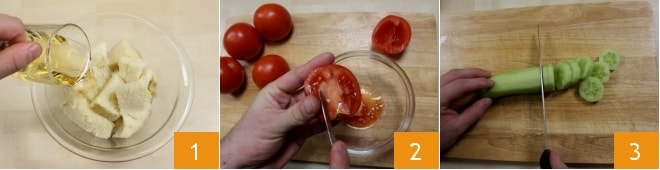 Pour préparer les pâtes froides au Gaspacho andalou, commencez par ce dernier : prélevez la mie du pain rassis, à mettre dans un bol et humectez-la avec de l'eau et du vinaigre de vin blanc 1 ; laissez-la absorber les liquides, puis égouttez-la avec une passoire et mettez-la de côté. Ensuite, passez au nettoyage et à la découpe des légumes : lavez et coupez en deux les tomates grappes, mettez-les dans un petit bol pour éliminer les graines internes 2 ; épluchez le concombre et coupez-le en rondelles 3.