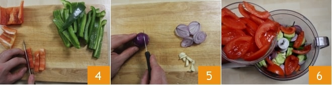 Poursuivez avec les poivrons verts et rouges : lavez-les et coupez-les en deux, retirez le pédoncule et les filaments internes avec les graines, puis réduisez les lobes en lamelles 4. Enfin, épluchez l'oignon rouge et la gousse d'ail et hachez-les grossièrement 5. Placez les légumes coupés en morceaux dans un mixeur 6, ajoutez l'huile d'olive extra vierge en filet, en ajustant également le sel et le poivre à votre goût