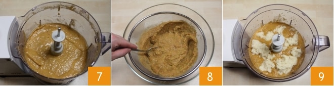 et faites fonctionner le mixeur pour obtenir un mélange lisse et homogène 7. Filtrez le mélange épais obtenu à l'aide d'une passoire fine et du dos d'une cuillère pour éliminer les éventuels résidus de peaux et de graines, en recueillant le mélange dans un bol 8. Transférez à nouveau le mélange dans le mixeur et ajoutez la mie bien essorée 9 et ajustez éventuellement le sel, le poivre ou le vinaigre.