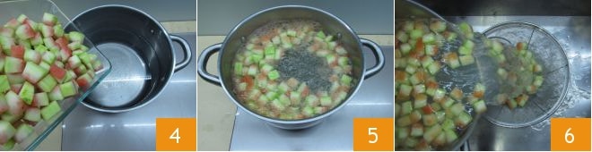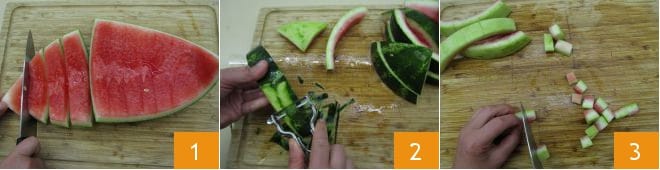 Pour préparer la pastèque confite, commencez par la peau qui doit être bien nettoyée de la pulpe rouge, puis coupez-la en lamelles 1. Ensuite, pelez la peau, en éliminant la partie la plus sombre, à l'aide d'un économe 2. Coupez en cubes d'environ 1 cm et maintenant vous devrez répéter cette opération trois fois afin que la peau ait la bonne consistance 3.