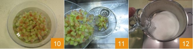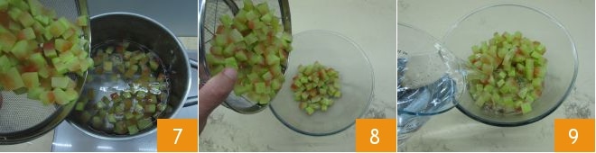 et répétez encore deux fois 7. La troisième et dernière fois, égouttez les cubes en les versant dans un bol 8 et ensuite couvrez-les d'une abondante eau froide 9.