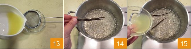 Allumez le feu et laissez le mélange atteindre une consistance visqueuse semblable à celle du miel ; cela prend environ 20/25 minutes. Pressez le citron et filtrez le jus 13, dans la casserole avec le sirop, versez la gousse de vanille coupée en deux 14 et ensuite le jus filtré 15.
