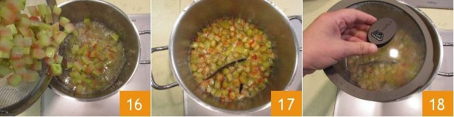 Plongez également les cubes de peau 16 et laissez-les cuire pendant environ 50 minutes à feu très doux, en remuant de temps en temps 17. Une fois les cubes confits, éteignez le feu, éliminez l'éventuelle écume en surface à l'aide d'une écumoire et ensuite couvrez avec le couvercle 18.