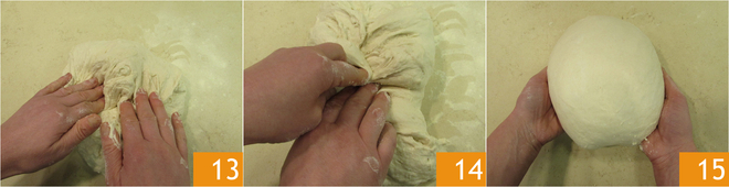 Saupoudrez le plan de travail d'une petite quantité de farine pour pinsa. Renversez la pâte sur le plan et donnez des plis de la manière suivante : prenez progressivement le bord de la pâte et tirez-le vers le centre 13. Vous verrez la pâte devenir plus lisse 14. Retournez-la ensuite et formez une boule en la faisant tourner sur le plan pour bien sceller la fermeture 15.