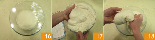 Transférez à nouveau la pâte dans un bol, cette fois huilé. Couvrez d'un film plastique 16 et laissez lever à température ambiante jusqu'à ce qu'elle double de volume ; cela prendra environ 2 heures. Ensuite, placez-la au réfrigérateur pendant 24 heures. Au terme de ce temps, la pâte sera très gonflée et aérienne 17. Préparez un bol avec de la semoule, puis prélevez à la main, les mains légèrement humidifiées, des portions de pâte de 250-300 g. Vous devrez littéralement « étrangler » la pâte : soulevez une partie de pâte par en-dessous avec une main et, avec l'autre, détachez-la, presque comme on le ferait avec de la mozzarella 18.