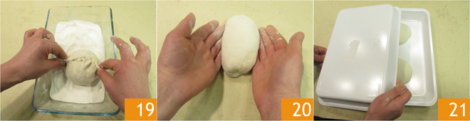Déposez chaque morceau de pâte sur la semoule côté lisse vers le bas, puis pincez la fermeture de chaque pâton 19. Retournez-le ensuite sur le plan avec la partie pincée vers le bas et faites tourner la pâte avec les deux mains afin de bien la sceller 20. Placez le pâton sur un plateau, côté lisse vers le haut. Procédez de la même manière pour les autres pâtons et disposez-les sur le plateau en les espaçant bien. Couvrez avec un autre plateau 21 et laissez lever 3-4 heures à température ambiante jusqu'à ce qu'ils doublent de volume.