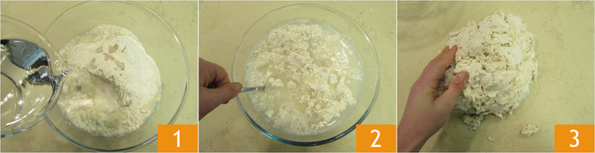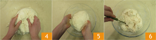 Travaillez longuement jusqu'à obtenir une consistance lisse et homogène 4. Transférez la pâte dans un saladier 5 et pratiquez 3 entailles avec le couteau 6 : cette opération aide les autres ingrédients à mieux s'incorporer.