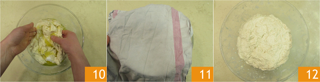 Poursuivez le pétrissage à la main pendant quelques minutes 10 pour bien faire absorber tous les ingrédients. Vous pouvez aussi pétrir sur le plan de travail et effectuer quelques plis de renforcement si vous préférez. La pâte sera déjà plus lisse. Pour la rendre encore plus lisse, laissez-la dans le saladier couverte d'un torchon pendant 15 minutes 11. Au bout de ce temps, découvrez le saladier 12.