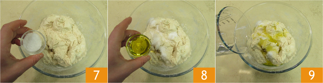 Versez ensuite le sel 7, l'huile 8 et les 50 g d'eau froide restants ; ajoutez cette dernière petit à petit 9, tout en continuant à pétrir.