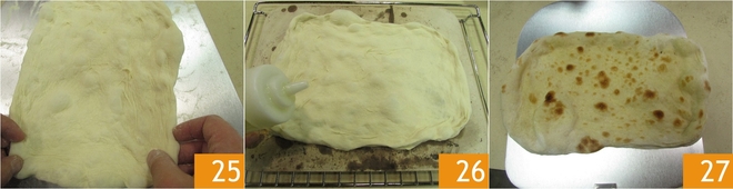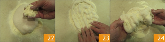 Une fois le temps de pousse des pâtons écoulé, prenez-en un et déposez-le sur un plan de travail généreusement saupoudré de semoule. Saupoudrez aussi la surface avec de la semoule 22. En partant du bord le plus proche de vous vers l'extérieur, appuyez légèrement avec les doigts pour aplatir la pâte. Vous devez presser en plaçant les doigts presque parallèles au plan de travail afin de répartir l'air uniformément 23. Donnez-lui une forme le plus possible rectangulaire/ovale. En soulevant délicatement la pâte, essayez d'enlever l'excès de semoule 24.