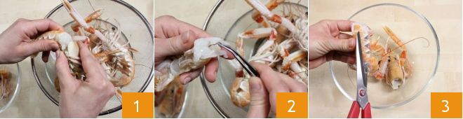 Pour réaliser le feuilleté classique avec des langoustines sautées au balsamique, commencez par nettoyer les langoustines : d'abord, lavez bien les langoustines sous l'eau courante froide, retirez la tête 1 et extrayez l'intestin à l'aide de pinces de cuisine 2. Coupez les parties latérales de la carapace avec des ciseaux 3