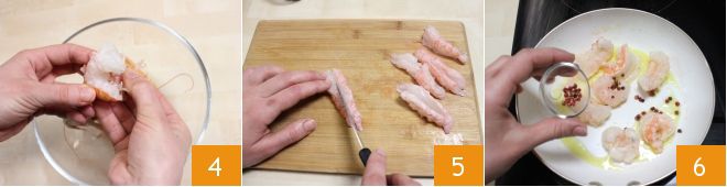 et retirez l'intérieur 4, de cette façon vous pourrez garder la chair entière. Faites une incision sur le dos de la langoustine 5. Placez une poêle sur le feu avec un filet d'huile, ajoutez les langoustines nettoyées, ajoutez le poivre rose 6 et faites-les sauter pendant 5 minutes,