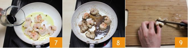 après ce temps, ajoutez le vinaigre balsamique 7 et salez. Faites cuire encore 10 minutes à feu vif pour que la sauce épaississe 8. À ce stade, les langoustines sont prêtes, coupées en deux 9