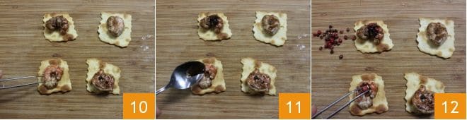 et commencez à composer les amuse-bouches : prenez une feuilletée, placez dessus une demi-langoustine 10, assaisonnez encore avec quelques gouttes de vinaigre balsamique 11 et des grains de poivre rose 12. Votre feuilleté classique avec langoustines sautées au balsamique est maintenant prêt à être servi !