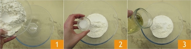 Pour préparer la pâte folle, versez dans un bol la farine 1, le sel 2, et le vin 3.