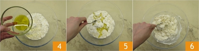 Ajoutez également l'huile 4. Mélangez avec une cuillère ou une fourchette 5 jusqu'à ce que les ingrédients commencent à s'amalgamer 6.