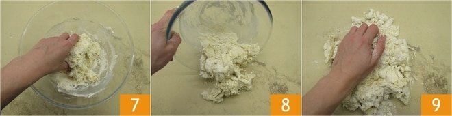 Commencez à pétrir à la main 7, puis transférez la pâte sur le plan de travail 8 et continuez à la travailler 9.