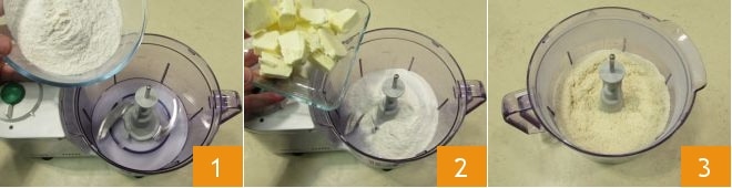 Pour préparer la pâte sablée au cacao, mettez dans un mixeur la farine tamisée 1 et le beurre froid coupé en dés 2. Mixez le tout jusqu'à obtenir une consistance sableuse et farineuse 3