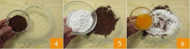 puis transférez-le sur un plan de travail fariné. Formez la classique fontaine, puis versez au centre le cacao en poudre tamisé 4, le sucre glace 5 et les 3 jaunes d'œufs 6.