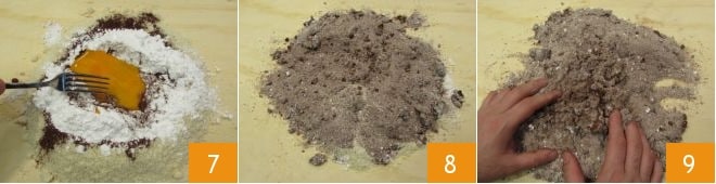 Mélangez les ingrédients en vous aidant d'une fourchette (7-8) puis continuez à pétrir énergiquement à la main 9