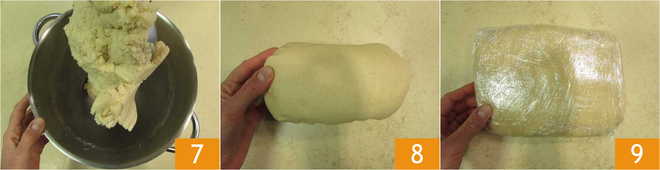 Vous devez obtenir une pâte lisse, homogène et compacte 7. À ce stade, transférez la pâte sur le plan de travail et formez une boule 8, couvrez-la de film alimentaire 9 et laissez-la reposer au réfrigérateur pendant au moins 30 minutes avant de l'utiliser. Votre pâte sablée sans œufs est prête !