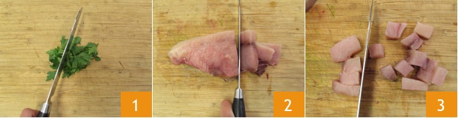 Pour préparer les pâtes à l'espadon et à la menthe, hachez finement le persil 1. Coupez l'espadon 2 pour obtenir des dés de quelques centimètres 3.