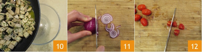 Dès que l'alcool s'est évaporé, mettez l'espadon de côté avec une assiette par-dessus 10 et gardez la poêle de côté. Épluchez l'oignon et tranchez-le 11. Ensuite, coupez les tomates cerises en quatre 12.