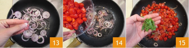 Mettez la casserole d'eau pour les pâtes sur le feu et, entre-temps, dans la poêle précédente, versez encore un peu d'huile puis l'oignon et faites-le dorer avec une pincée de sel 13. Ajoutez les tomates cerises 14 puis la menthe et le basilic hachés 15.