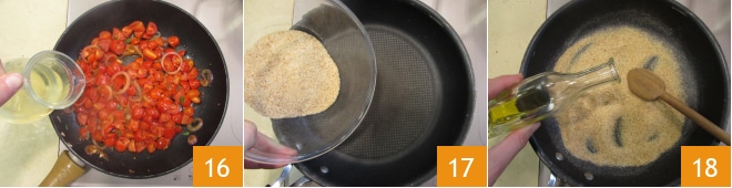 Après 5 minutes de cuisson, déglacez avec le vin blanc 16 et lorsque l'alcool s'évapore, baissez le feu et laissez cuire. Pendant ce temps, dans une autre poêle, versez la chapelure 17 et laissez-la griller en remuant continuellement. Une fois dorée, éteignez le feu et continuez à remuer quelques instants. Puis ajoutez une goutte d'huile, mélangez à nouveau 18.
