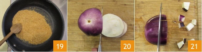 Continuez à remuer jusqu'à ce qu'elle devienne granuleuse 19, puis mettez de côté. Passez à l'aubergine : il faudra les laver, les équeuter et les trancher 20 ; enfin, coupez-les en dés plus ou moins de la même taille que ceux de l'espadon 21.
