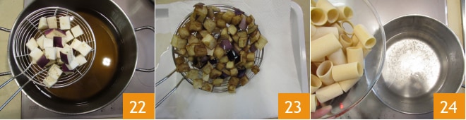 À ce stade, chauffez l'huile d'olive extra vierge et faites frire les dés d'aubergines petit à petit 22. En quelques minutes, ils seront dorés, donc égouttez-les sur du papier absorbant 23. À ce stade, l'eau devrait être en ébullition, salez et faites cuire les paccheri 24.