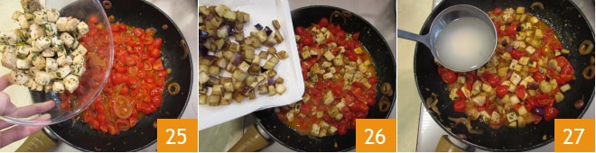 Ajoutez aux tomates cerises l'espadon 25, les aubergines 26, puis versez une louche d'eau des pâtes 27.