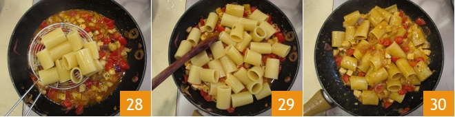 Égouttez les paccheri al dente dans la sauce 28, et terminez la cuisson en remuant souvent et en faisant attention à ne pas casser les paccheri 29. Une dernière secousse et éteignez 30.