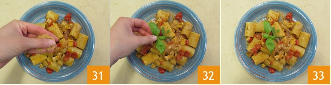 Dressez les assiettes en ajoutant sur chaque plat individuel les miettes de chapelure 31, une feuille de basilic 32 et de menthe. Voici vos pâtes à l'espadon et à la menthe prêtes 33.