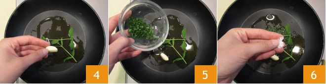 Dans une poêle, versez un filet d'huile, ajoutez quelques brins de menthe et une gousse d'ail en chemise 4. Ajoutez le persil haché et une pincée de sel 6.