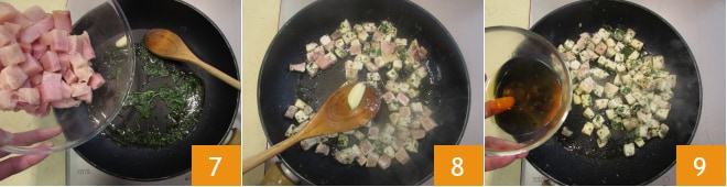 Peu après, ajoutez l'espadon 7 et faites-le grésiller avant de saler, poivrer et retirer l'ail 8. Après quelques minutes, il deviendra blanc et tendre, puis déglacez avec le brandy 9 : flambez le mélange en inclinant la poêle sur le feu ou, si vous avez une plaque à induction, en utilisant un chalumeau. Faites très attention à la flamme.