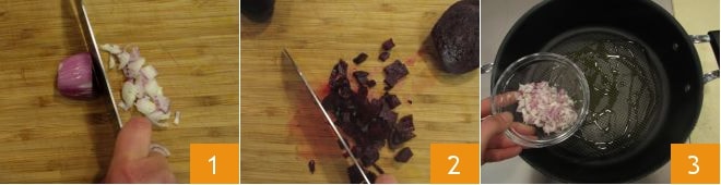 Pour réaliser les pâtes à la betterave et au pecorino, commencez par éplucher et hacher l'échalote avec un couteau 1. Coupez les betteraves en tranches puis en cubes 2. Portez à ébullition une casserole remplie d'eau salée qui servira pour la cuisson des pâtes. Versez un filet d'huile dans une poêle, ajoutez l'échalote hachée 3.