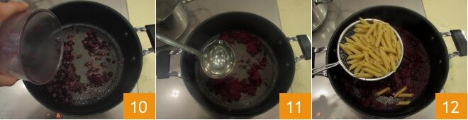 que vous ajouterez à l'assaisonnement dans la casserole 10. Versez une petite louche d'eau chaude sur l'assaisonnement 11, salez et poursuivez la cuisson de l'assaisonnement pendant environ deux minutes à feu vif. Pendant ce temps, faites cuire les pâtes, en les retirant environ trois minutes avant la fin de la cuisson (reportez-vous aux instructions de cuisson sur l'emballage). Égouttez les pâtes directement dans la casserole avec l'assaisonnement 12