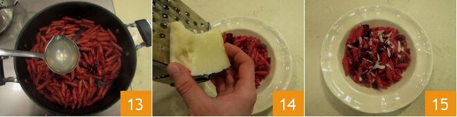 ajoutez une louche d'eau de cuisson des pâtes 13 et mélangez le tout à feu doux jusqu'à ce que la cuisson soit terminée. Servez vos pâtes bien chaudes, assaisonnez avec du poivre noir et râpez du pecorino romano en gros copeaux (14-15).