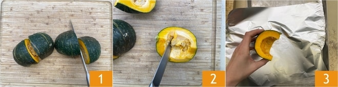 Pour préparer les pâtes à la courge et à l'huile de ciboule, prenez la courge, divisez-la en quatre parts 1, gardez la peau, mais retirez les graines et les filaments internes 2. Enveloppez les morceaux dans du papier aluminium adapté à la cuisson au four 3.