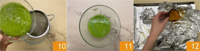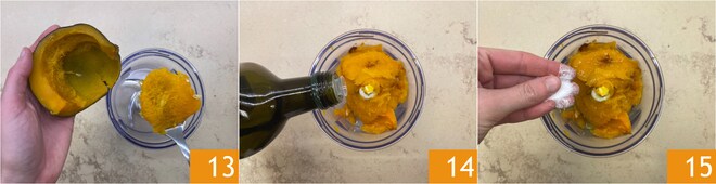 Filtrez la purée obtenue à travers un tamis fin (10, vous obtiendrez ainsi une huile aromatisée 11. Une fois la courge prête, sortez-la du four 12.
