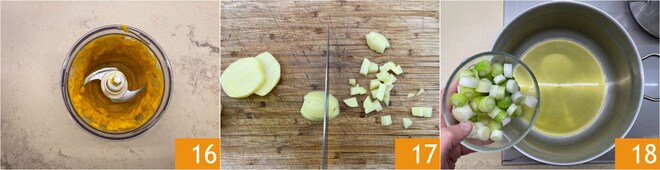 Mixez jusqu'à obtenir une crème homogène et mettez de côté 16. Pelez et coupez les pommes de terre en cubes 17. Dans une casserole haute, versez un filet d'huile d'olive et la partie blanche de la ciboule 18.