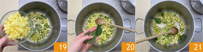 Ajoutez les pommes de terre 19 et assaisonnez avec le laurier 20. Salez et poivrez, faites revenir à feu modéré 21.