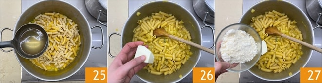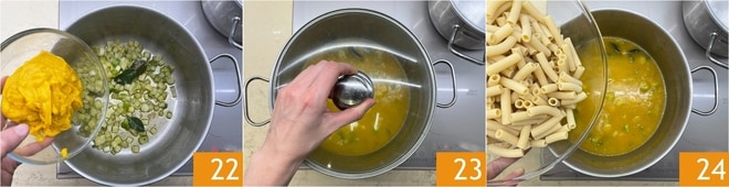 Ajoutez la crème de courge 22, mélangez bien le tout et versez 2 louches de bouillon de légumes ou d'eau chaude, couvrez avec le couvercle et laissez cuire 10 minutes 23. À ce stade, versez les pâtes dans la casserole 24.