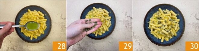 Dressez et assaisonnez avec l'huile de ciboule 28. Garnissez avec des graines de courge 29. Les pâtes à la courge et à l'huile de ciboule sont prêtes à être servies 30.