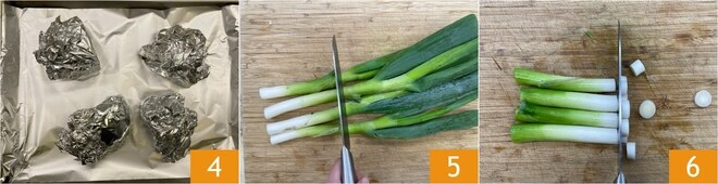 Couvrez une plaque de cuisson avec une autre feuille d'aluminium, déposez la courge et faites cuire dans un four préchauffé à 180° pendant 90 minutes 4, de cette manière la courge restera humide. Préparez ensuite l'huile de ciboule : séparez les sommets verts 5 et émincez la partie blanche 6.