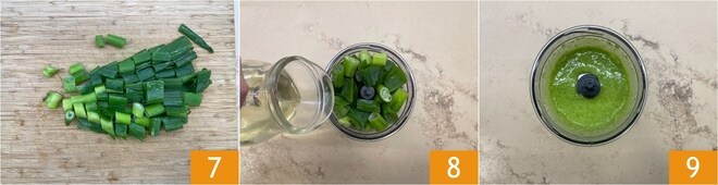 Coupez les sommets en morceaux 7 et mettez-les dans un mixeur en ajoutant l'huile de graines 8. Mixez pendant au moins 2/3 minutes 9, par intermittence.