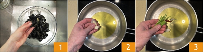 Ajoutez les moules 4, déglacez avec le vin blanc 5 et laissez évaporer l'alcool, puis couvrez avec le couvercle 6. Faites cuire pendant environ 5 minutes à feu vif, afin qu'elles s'ouvrent.