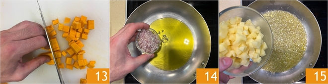 Nettoyez la courge et coupez-la en cubes de 1 cm 13. Chauffez l'huile dans la poêle, ajoutez l'échalote 14 et laissez-la fondre pendant quelques minutes. Lorsqu'elle est tendre et transparente, ajoutez les pommes de terre 15.