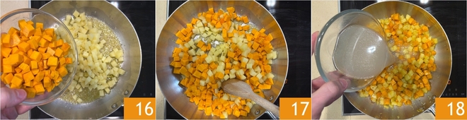 Ajoutez également la courge 16 et mélangez 17, puis versez le liquide de cuisson des moules 18.